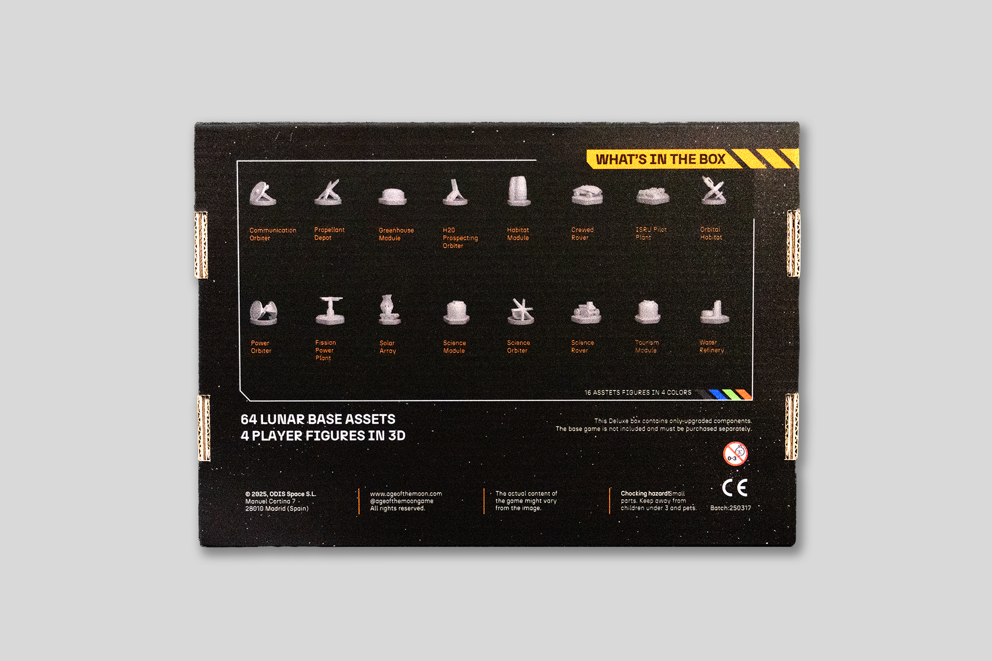 Enhance your Standard Game with this Limited Deluxe Add-on, featuring all 64 lunar base assets as stunning 3D figures plus 4 player figures. Please note: This set includes only the exclusive Deluxe Add-on Box - the Standard Game must be purchased separately.